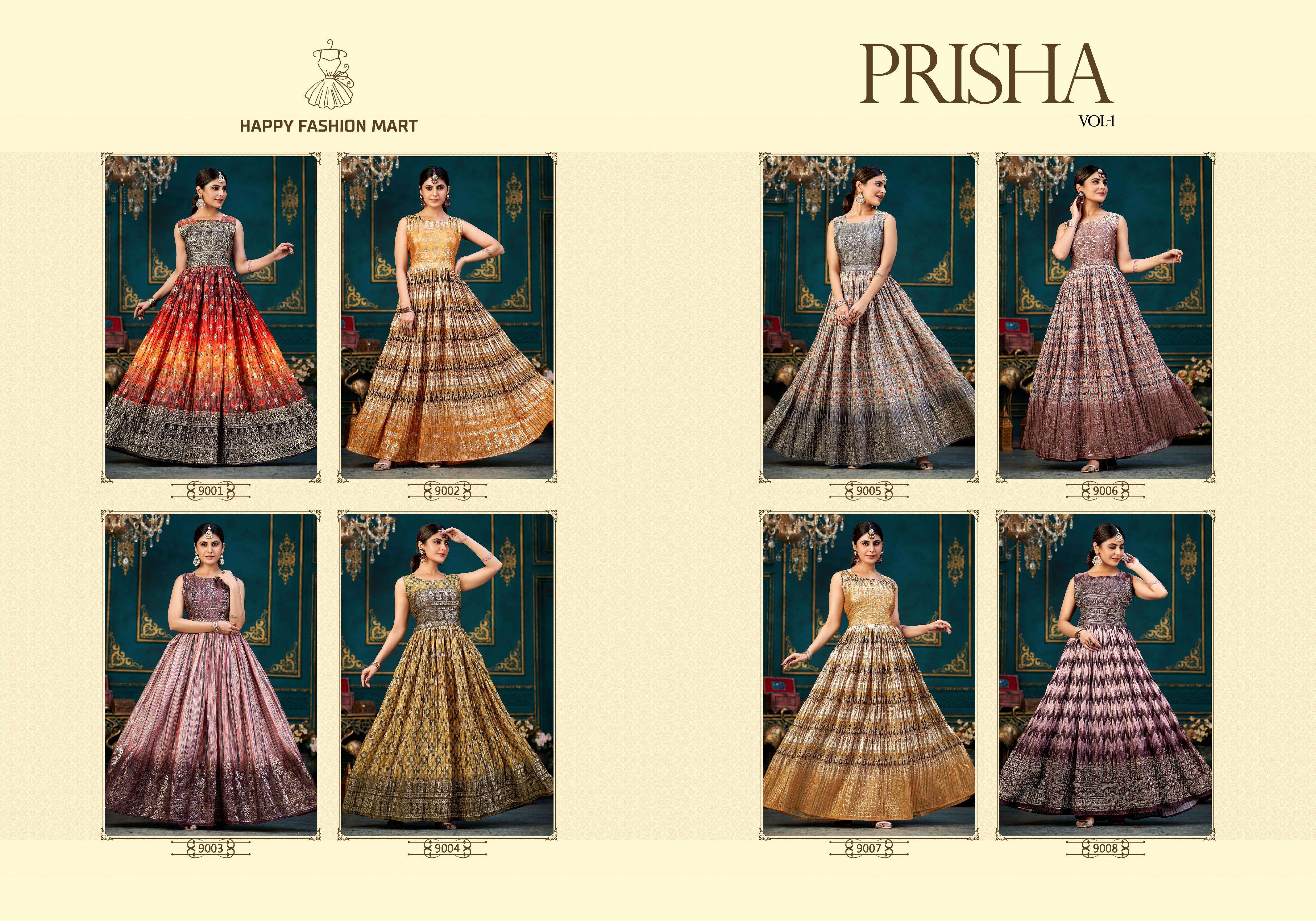 Dear Sir/Madam HAPPY FASHION MART Presents For This season Presenting Exclusive Super Hit gown Catalogue Name:- PRISHA VOL 1 ( 8 PCS ) Fabric : Chinnon silk with Digital Print ( Inner attached ) (With attached cups). Size : M-38 , L-40, XL-42 ,XXL-44 Work : Foil print. Sleev : ¾ inside the product Accessories : Belt with tassles as shown in the image Length : 56 inch Flair : 3.80 mtr |