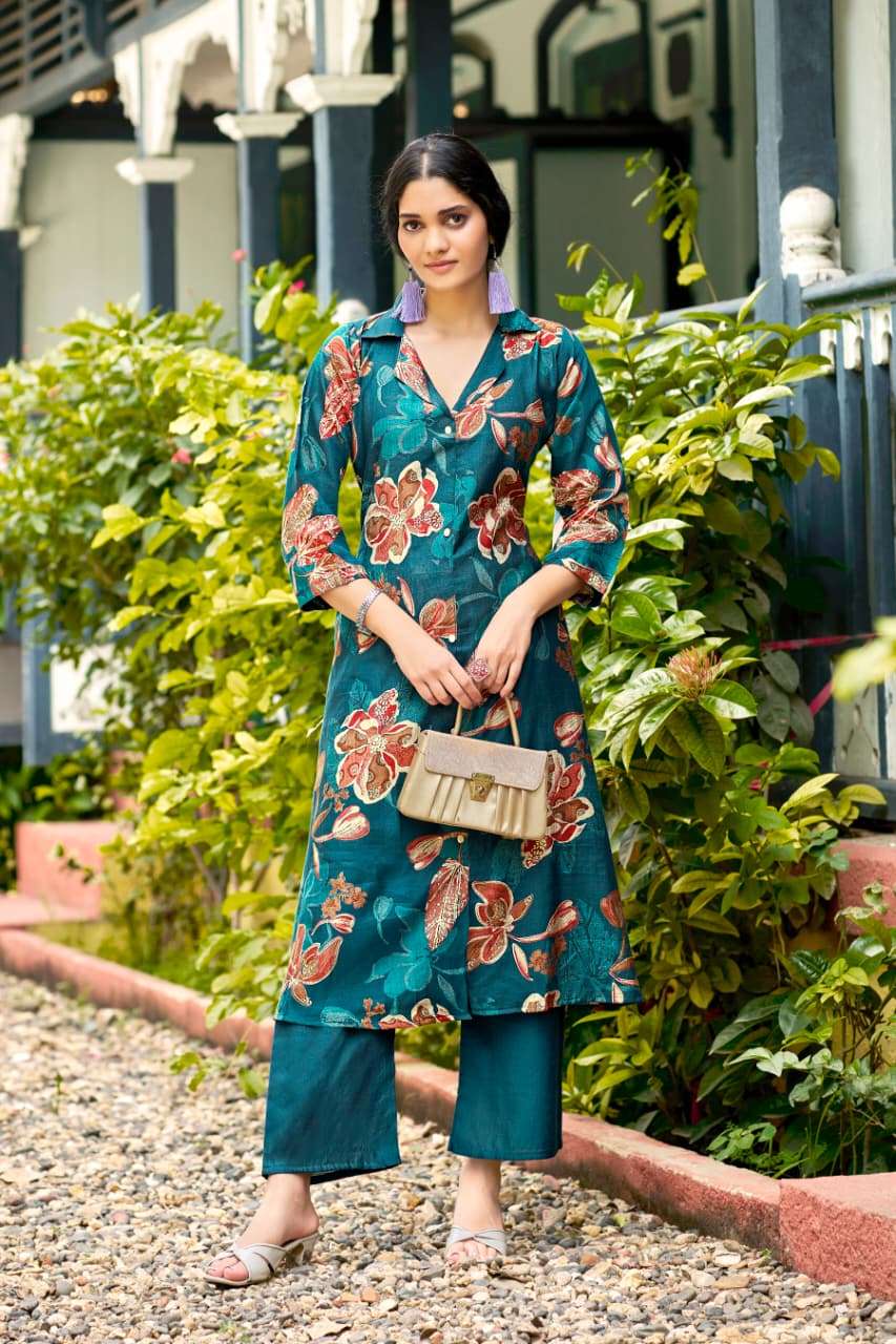 Catalouge : ROSY Vol 02 A LINE KURTI PANT Fabric in Top : Vetican Discharge Print Sleeves type : 3/4th |